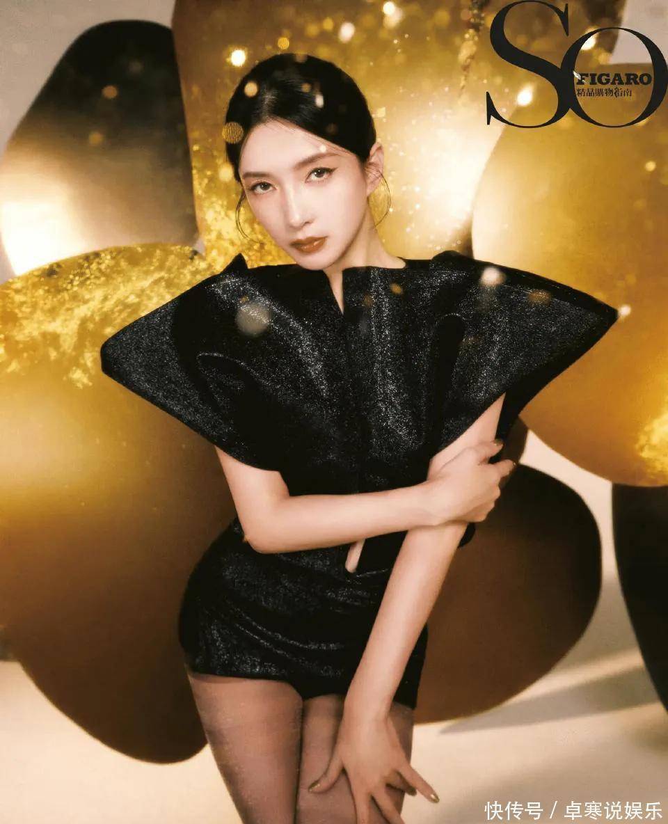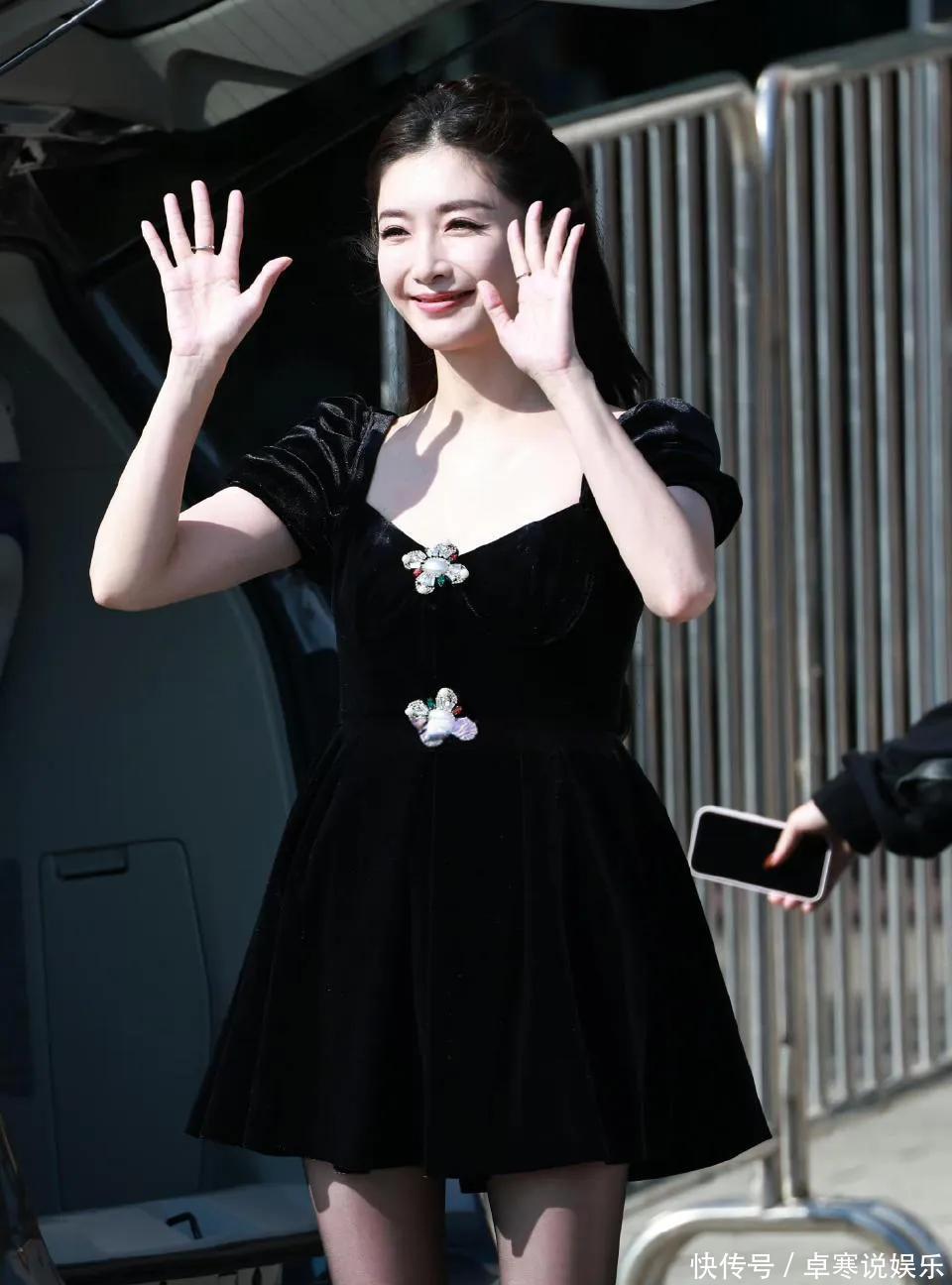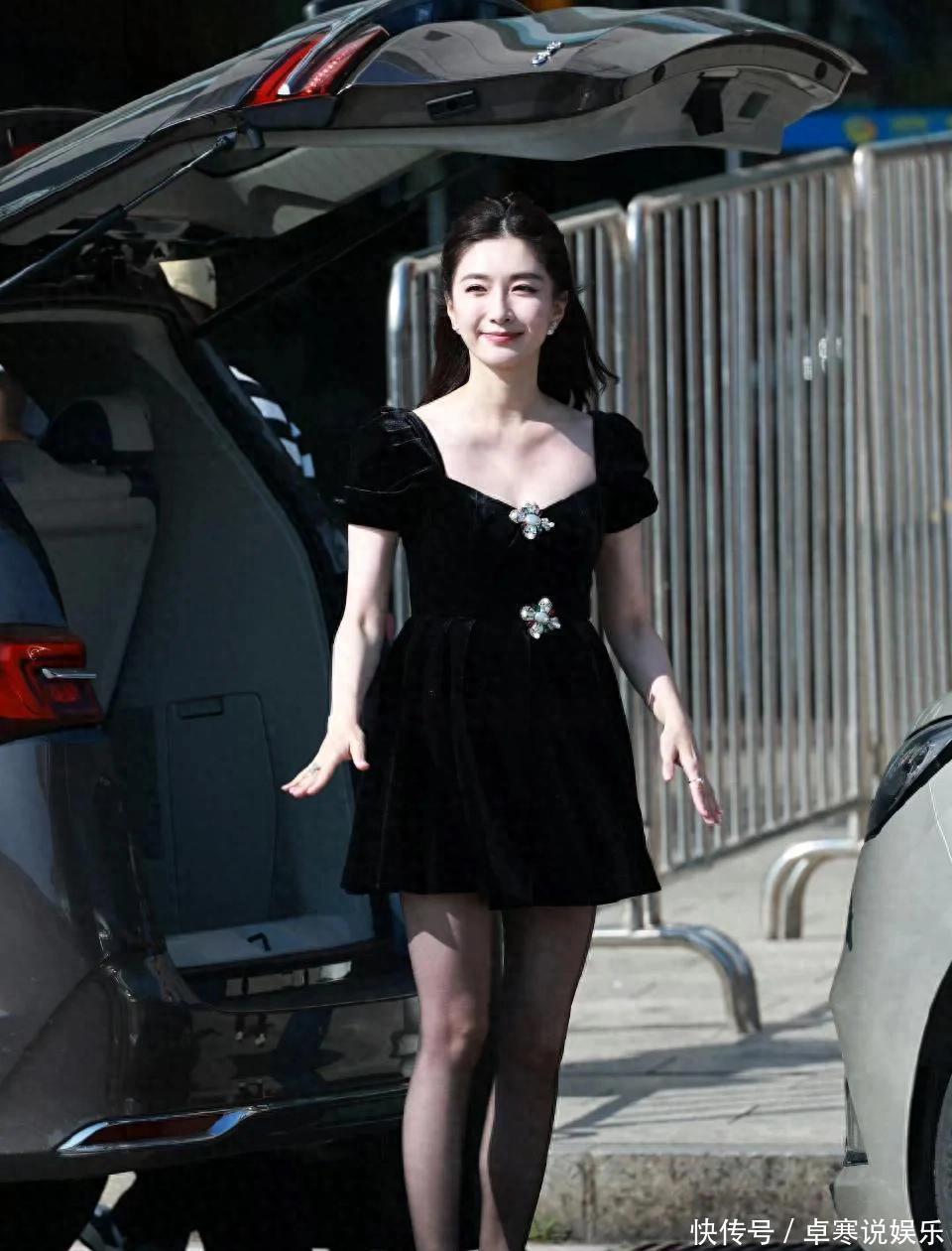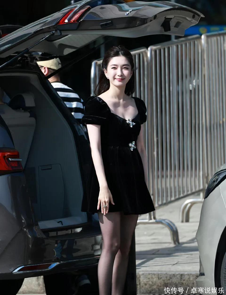 镜头里的江疏影,黑色丝绒短裙裹出腰臀曲线,泡泡袖中和了成熟感,胸口和腰间的水晶装饰像把星光缝在了裙上;黑丝没选“性感款”,而是半透的薄纱款,配厚底黑皮鞋,甜酷感直接拉满。