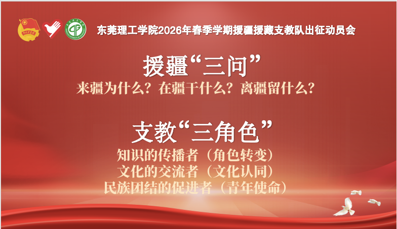 3月4日,学雷锋纪念日前夕,东莞理工学院举行2026年春季学期援疆援藏支教队出征动员仪式。10名援疆实习支教队队员整装出发,奔赴4800余公里外的新疆生产建设兵团第三师图木舒克市。上周,莞工第十一批大学生援藏(林芝)支教志愿服务队4名队员已先行抵藏,开始新一学期的教学工作。