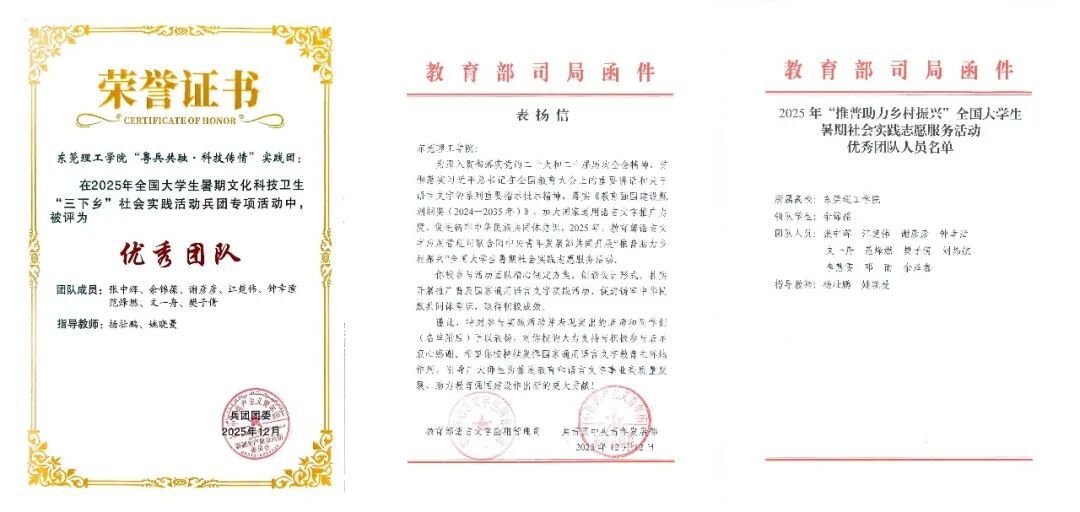 “科技+文化”夏令营、“粤兵两地同上一堂课”、“心桥信使”书信漂流、“推普正音小课堂”、“粤兵共语·同音传情”推普游园会……团队寓教于乐,依托丰富多元的活动,创新打造了“语言+科技+文化”三维帮扶模式,获得了教育部语言文字应用管理司与共青团中央青年发展部联合表扬,并获评2025年全国大学生暑期“三下乡”社会实践活动兵团专项优秀团队。