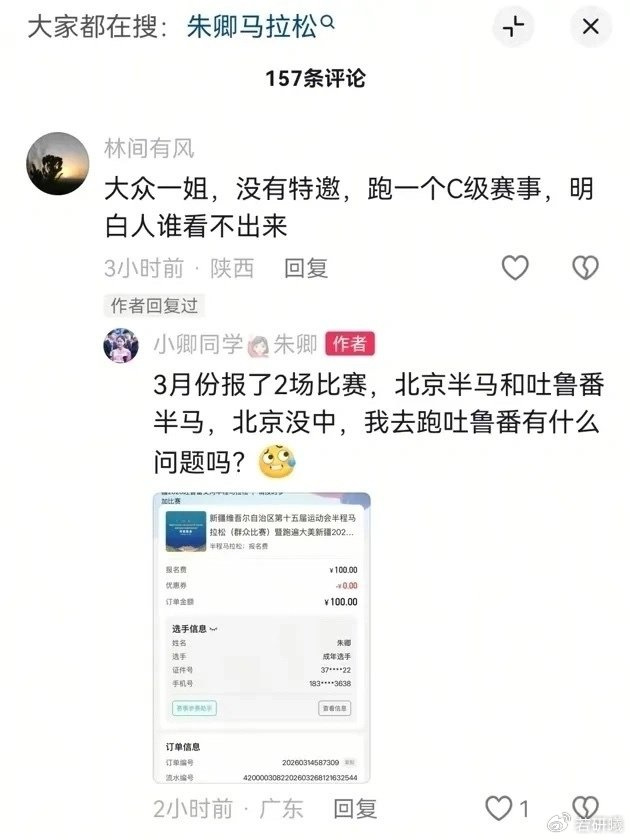 网友追问道:“大众一姐,没有特邀,跑一个C级赛事,明白人谁看不出来?”朱卿直接晒出1000元报名费的截图,回应:“3月份报了2场比赛,北京半马和吐鲁番半马,北京没中,我去跑吐鲁番有什么问题吗?”